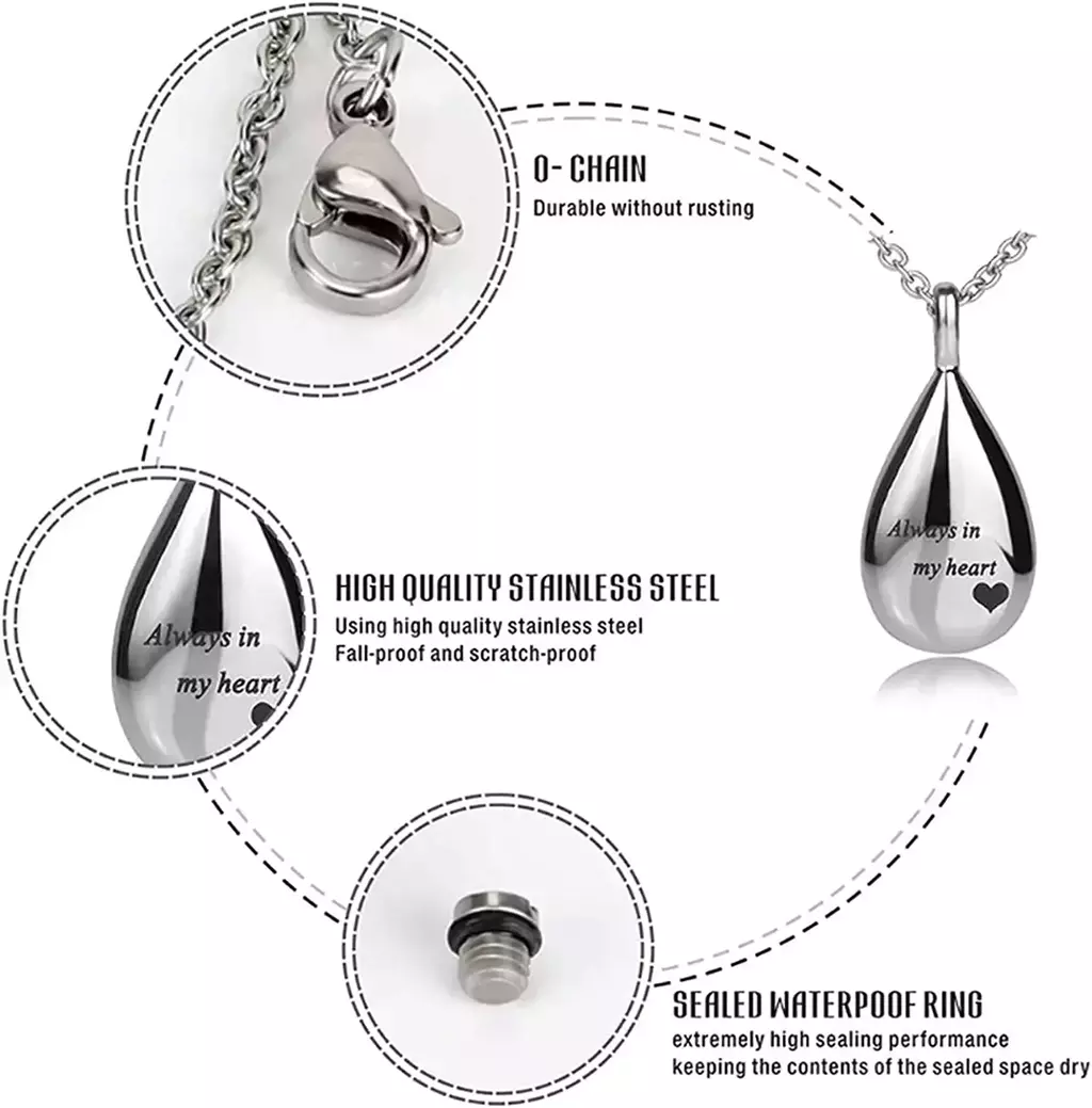 Com formato de lágrima e a gravação "Always in my heart" (Sempre no meu coração), esse pingente é feito em aço inoxidável de alta qualidade, resistente à oxidação, quedas e riscos. Seu compartimento interno com vedação rosqueada permite guardar pequenas cinzas, pelos, flores secas ou qualquer símbolo que represente seu felino. A corrente tipo “O” é durável, elegante e confortável para o uso diário.